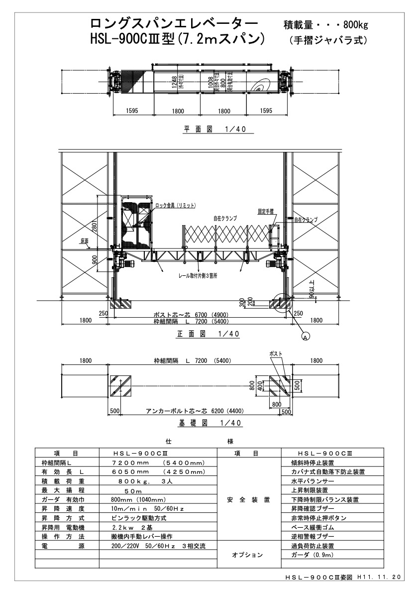 | 安全装置 | 傾斜時停止装置 ガバナ式自動落下防止装置 水平バランサー 上昇時制限装置 下降時バランス装置 昇降確認ブザー 非常時停止押ボタン ベース緩衝ゴム 逆相警報ブザー |