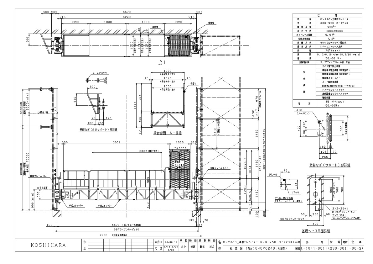 | 安全装置 | ガバナー式落下防止装置 搬器傾き矯正装置(制御盤内) 搬器傾き遮断装置(制御盤内) 搬器傾きストッパー 上・下限制御スイッチ ドアーリミッタスイッチ 遮断設置&リミッタスイッチ 警報装置 |